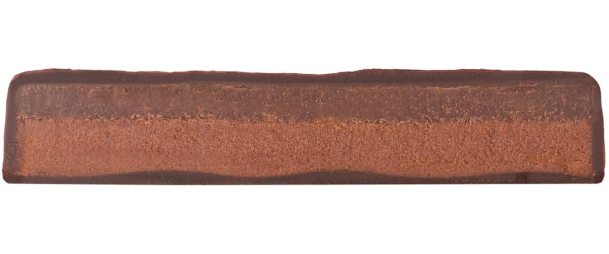 Unten eine weiche, schokoladig-schmelzende Moussefüllung aus hochprozentiger dunkler Schokolade mit 80 % Kakaoanteil, die in Butter schaumig gerührt wird und vor Schokoaromen sprüht. Oben eine dünnere dunkle Schokoganache aus Schokolade und Milch, mit einer Prise Salz. Umhüllt von klassischer dunkler Schokolade mit 70 % Kakaopower.
